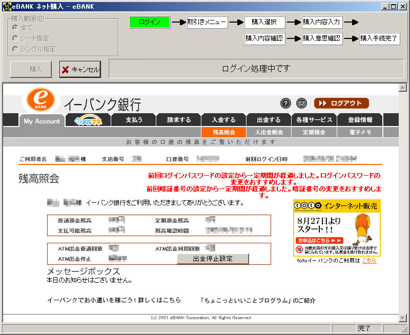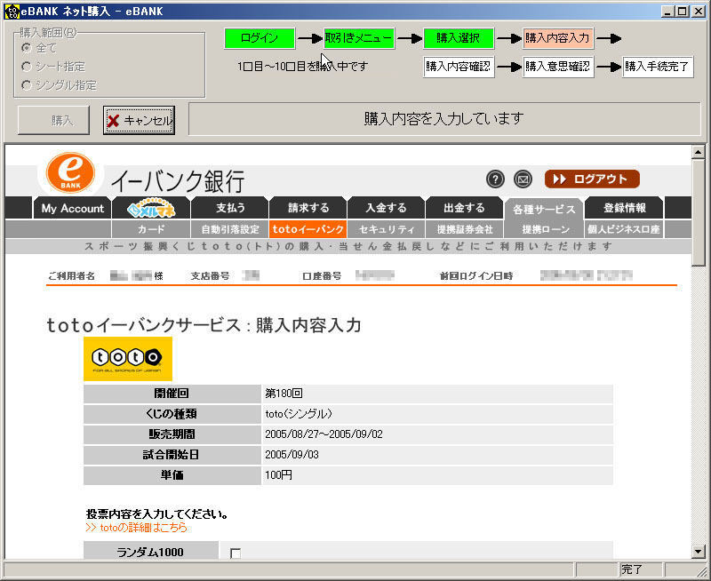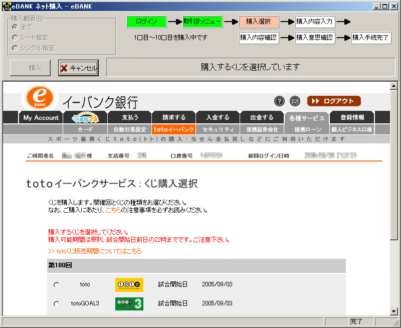 2005.08.27よりイーバンク銀行にて totoのインターネット購入ができるようになりました。